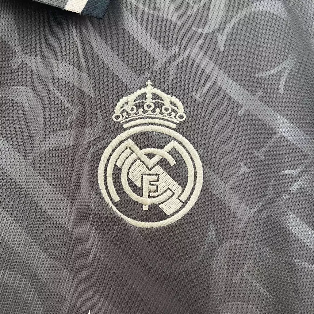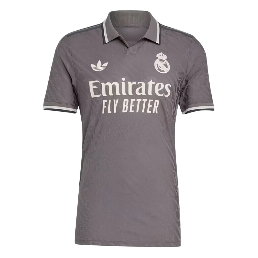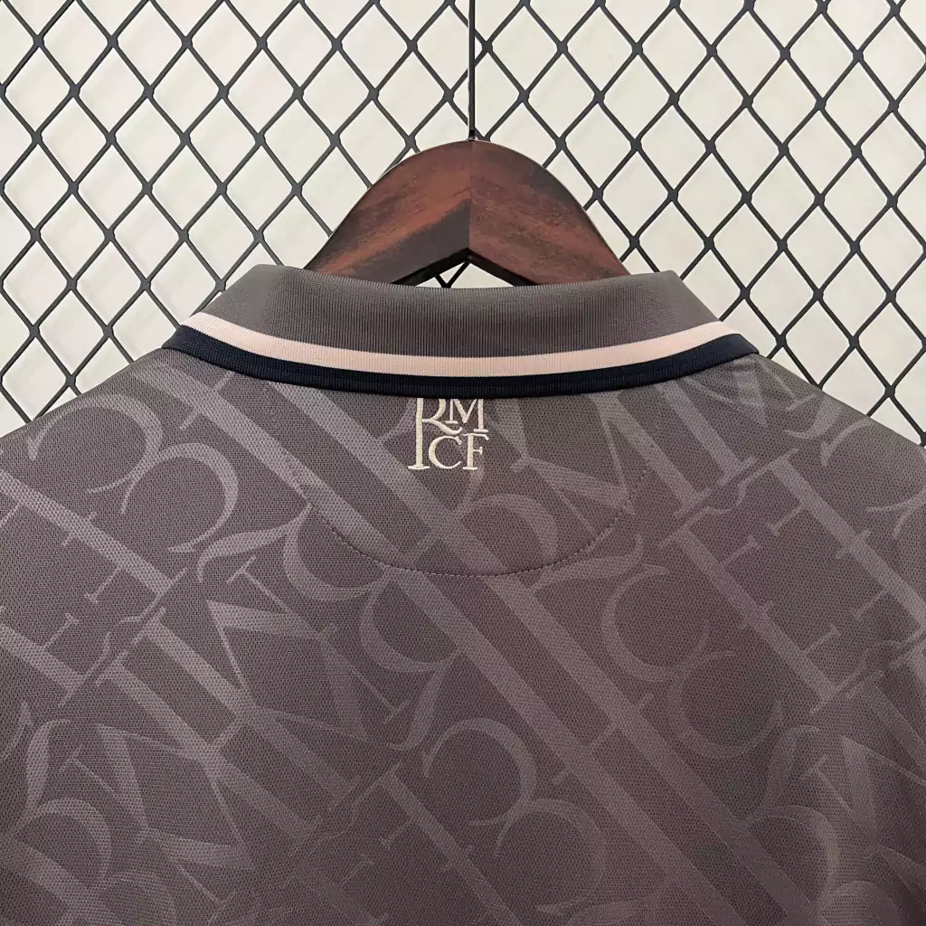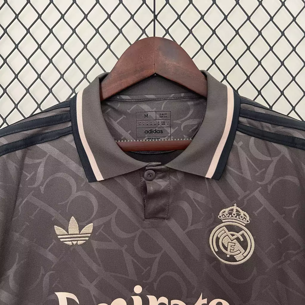 A gola é polo e traz frisos em rosa e em um cinza ainda mais escuro, além do carvão, cores que também são vistas nas três listras que percorrem os ombros. As três cores são novamente vistas nos punhos. O escudo do Real Madrid é aplicado no lado esquerdo do peito, no tom de rosa, que também aparece no trefoil, logo da Adidas, usado nas terceiras camisas da próxima temporada, bem como nos patrocinadores. Além disso, a sigla “RMCF” é vista na nuca em rosa.