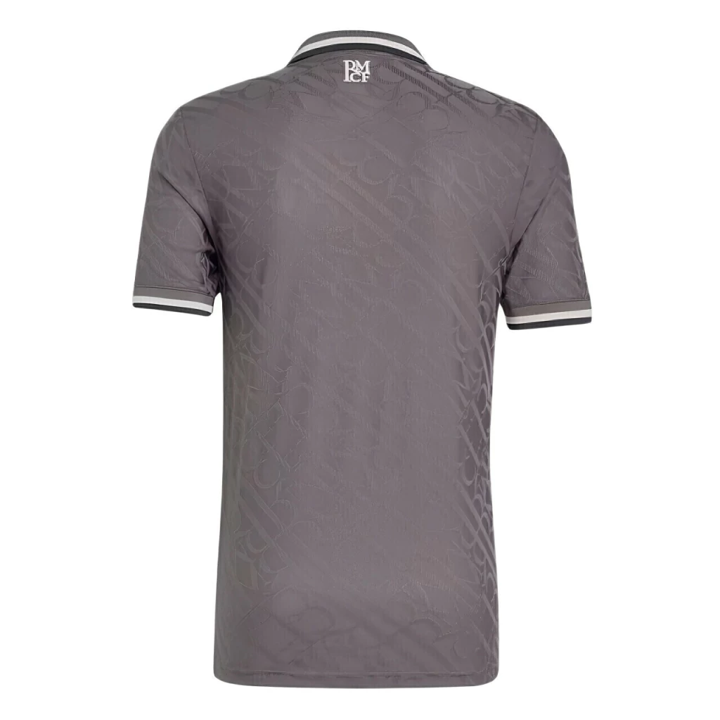 A nova terceira camisa do Real Madrid para a temporada traz um tom de cinza azulado, batizado como carvão, com um relevo da sigla “RMCF” aplicado ao longo de todo o manto.