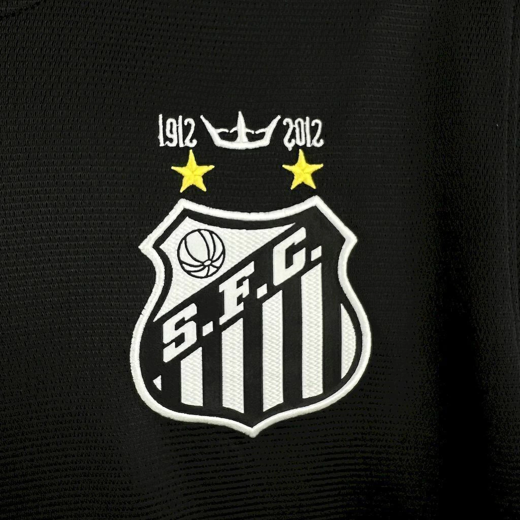 O manto do Santos é predominantemente preto, com detalhes brancos e laranja.