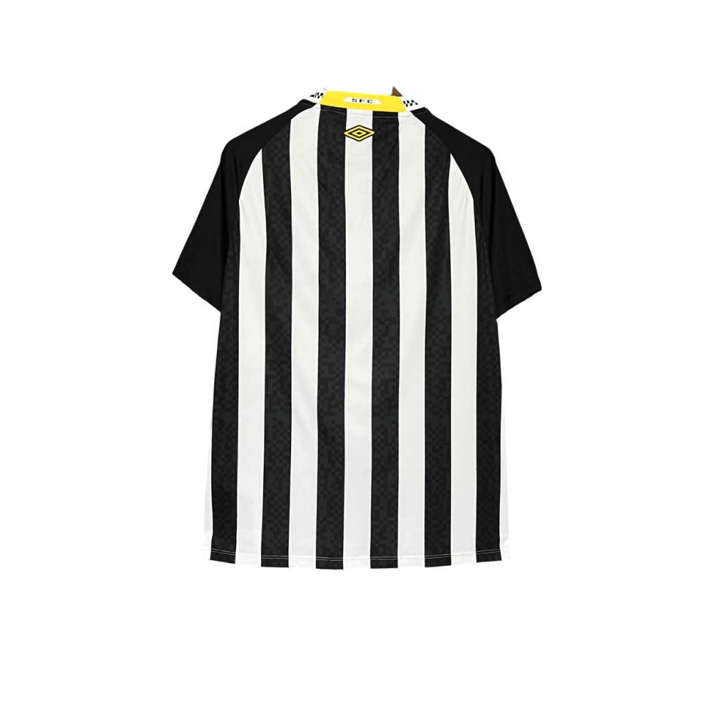 O emblema da Umbro é exibido em amarelo e preto no lado direito do peito, enquanto o escudo do Santos aparece à esquerda, em sua versão atual.