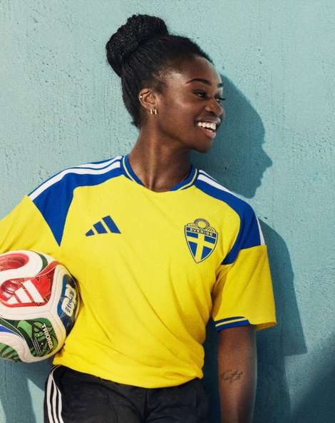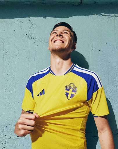 A camisa titular da Seleção da Suécia aposta no amarelo tradicional com detalhes florais sutis em um design inspirado no vinil, referência à música dos anos 70 e à banda ABBA.