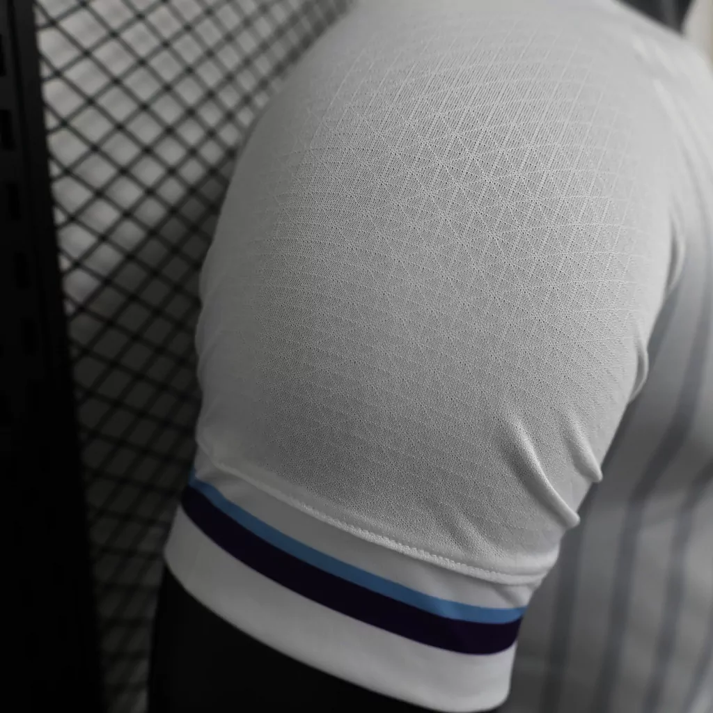 Baseado no mesmo template visto no kit principal, o manto reserva do Uruguai é predominantemente branco e apresenta finas linhas verticais em cinza, adicionando um toque sutil e elegante ao design.