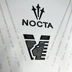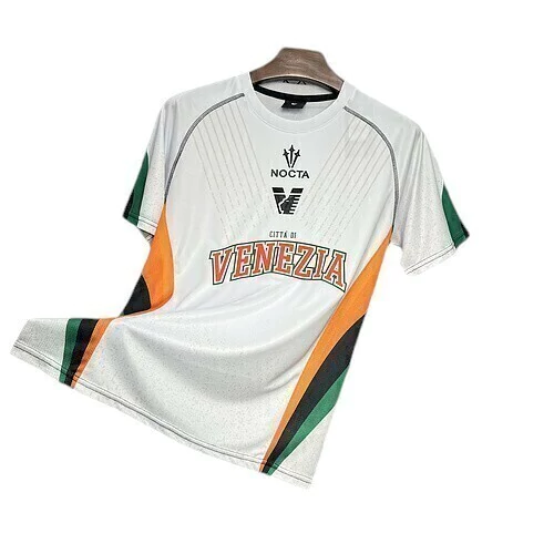 A gola é redonda e branca, enquanto o logo da NOCTA surge em preto, seguido do escudo do Venezia também em preto.