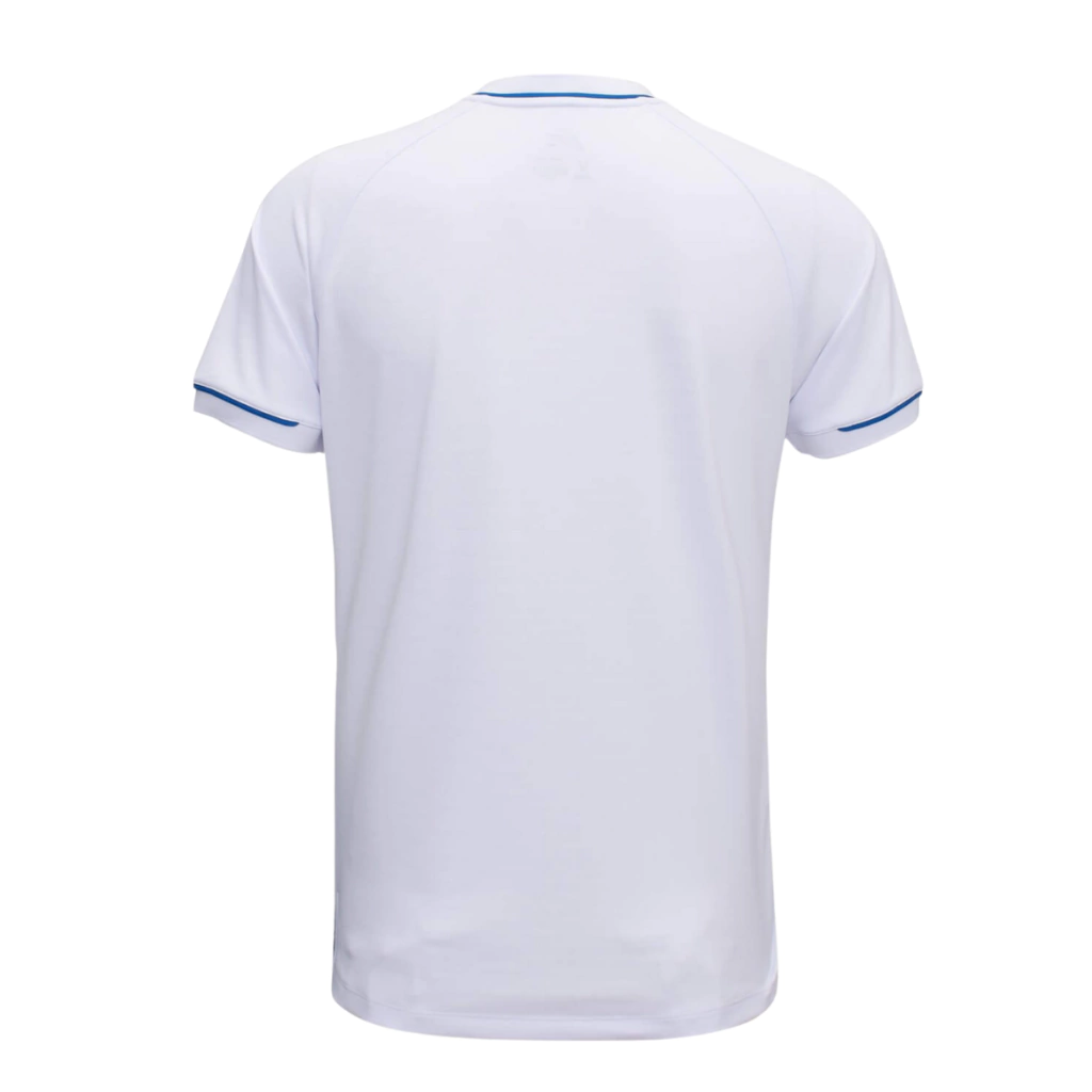 O uniforme reserva adota o mesmo template do modelo principal, mas surge em branco, com elegantes detalhes em azul-celeste.