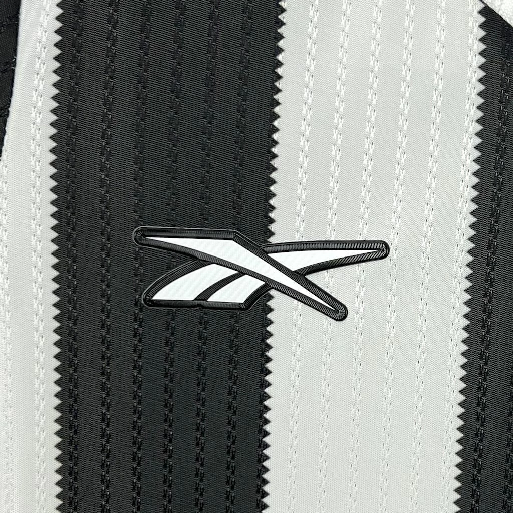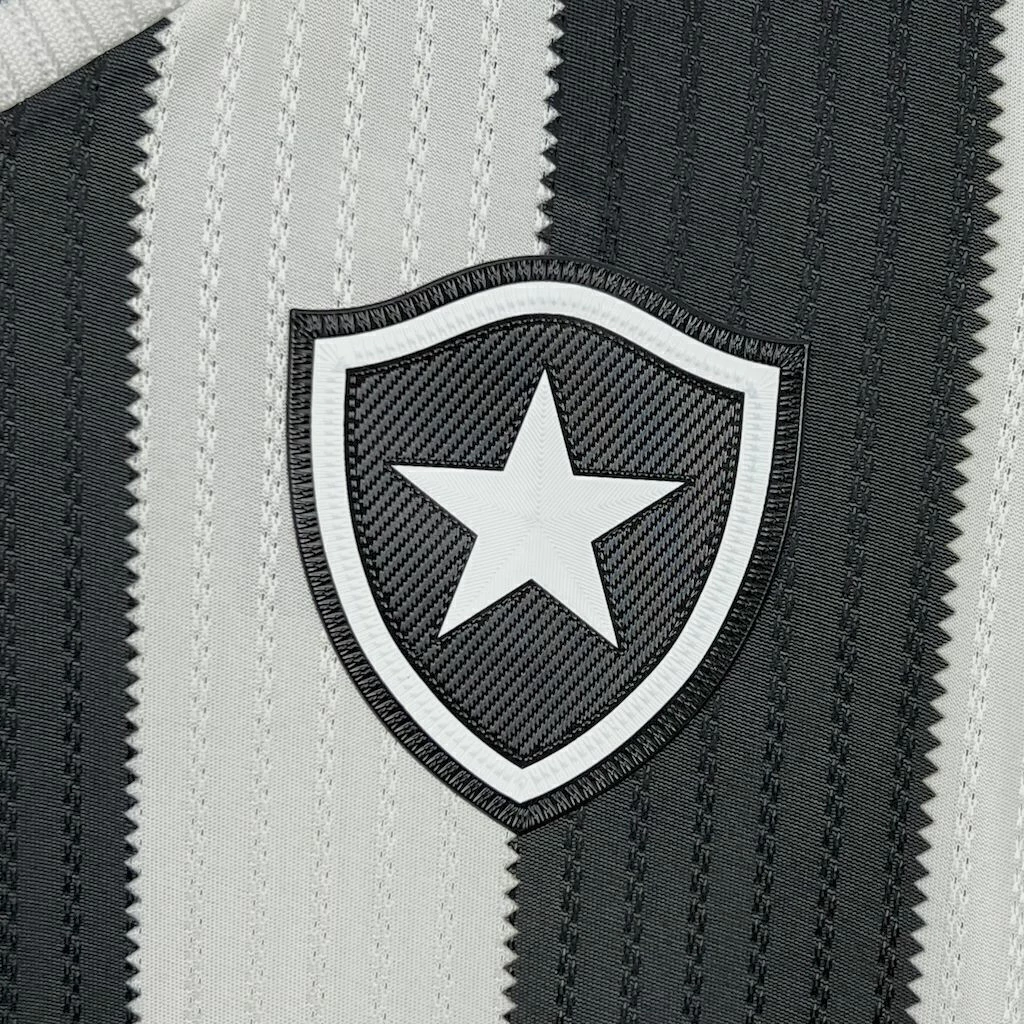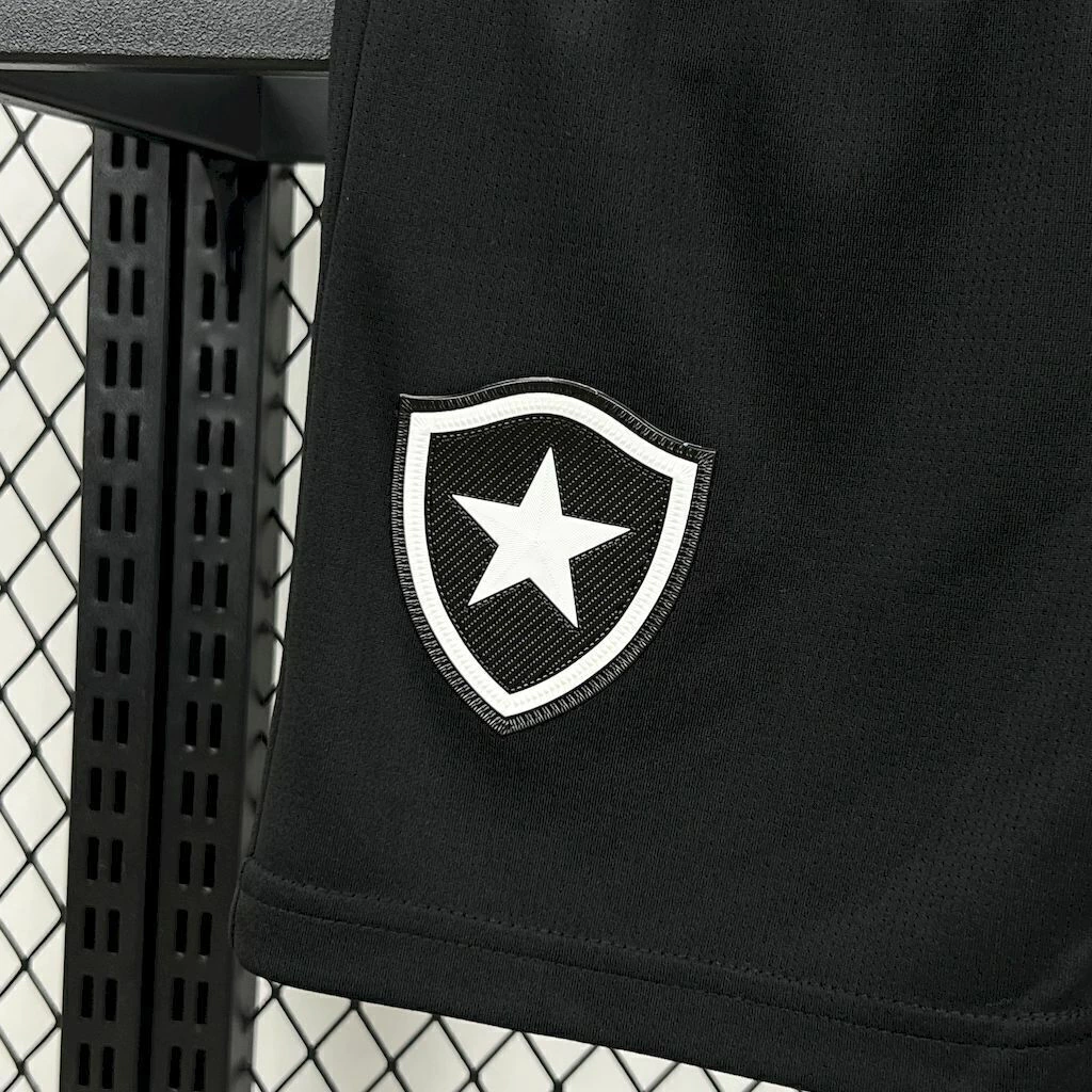 O escudo do Botafogo é aplicado em TPU no lado esquerdo do peito, enquanto o logo da Reebok, em branco com contorno preto, está no lado direito.