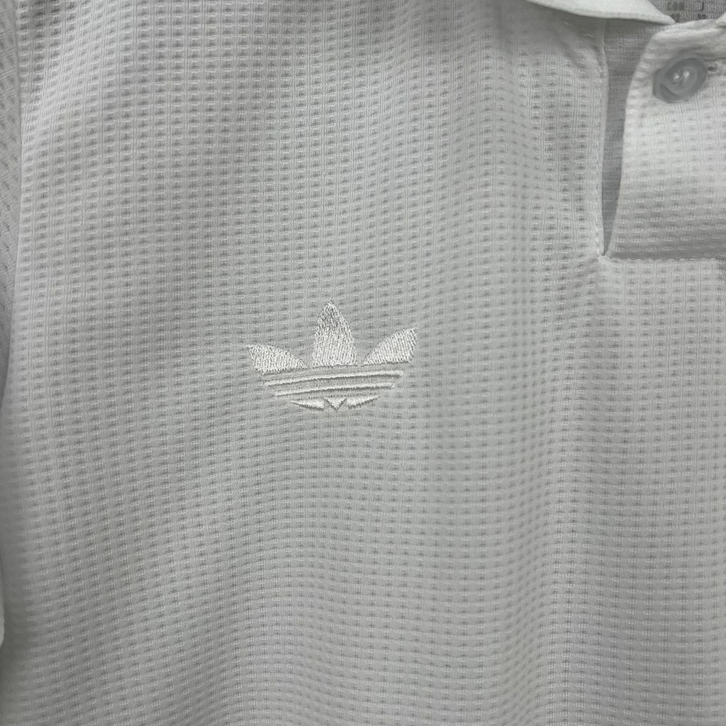 A camisa é predominante branca e apresenta visual limpo com gola polo e escudo do clube aplicado no lado esquerdo do peito. O logo da adidas aparece de forma discreta, bordado do lado direito.