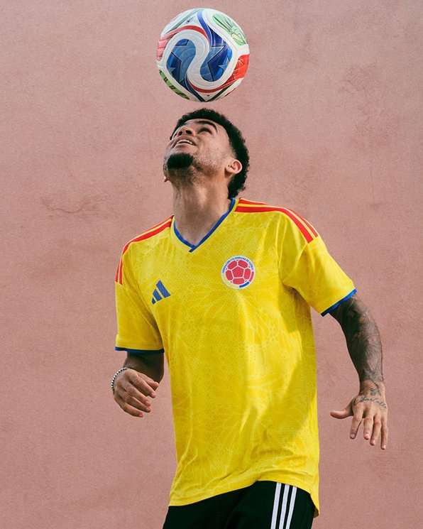 A camisa titular da Seleção da Colômbia para a Copa do Mundo de 2026 traz o amarelo tradicional como base e um grafismo inspirado nas borboletas amarelas de Gabriel García Márquez, símbolo recorrente em Cem Anos de Solidão, associado a amor, presença e destino.