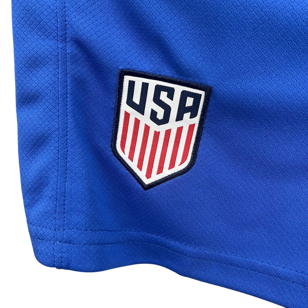 O short é completamente azul-royal, com corte tradicional e caimento confortável, e conta com o escudo dos EUA e o swoosh da Nike aplicados na parte frontal, ambos em vermelho e branco, criando contraste elegante.