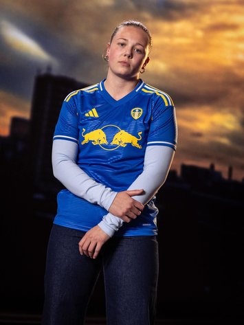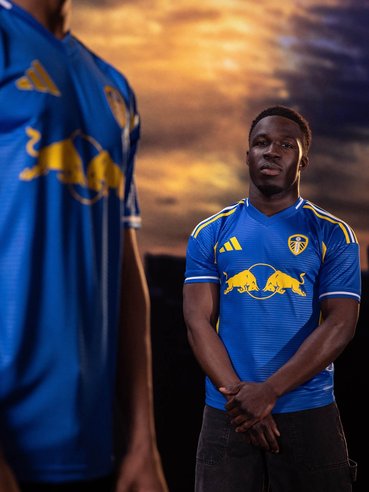 A nova camisa do Leeds adota o tradicional azul como base, com padrão horizontal em relevo e detalhes em amarelo vibrante que criam contraste moderno.
