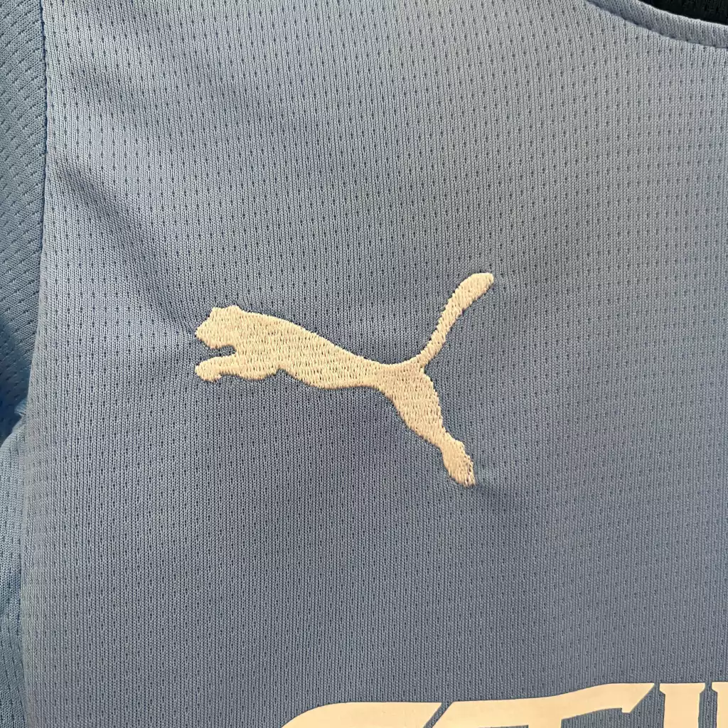 Na nuca, o nome “City” aparece em branco. O código "0161" é repetido no interior da gola, na etiqueta. A PUMA estampa seu logotipo em branco nas mangas e no lado direito, enquanto o escudo do Manchester City está no lado esquerdo, em sua versão padrão atual.
