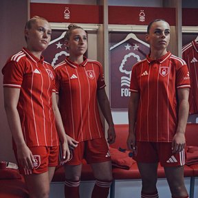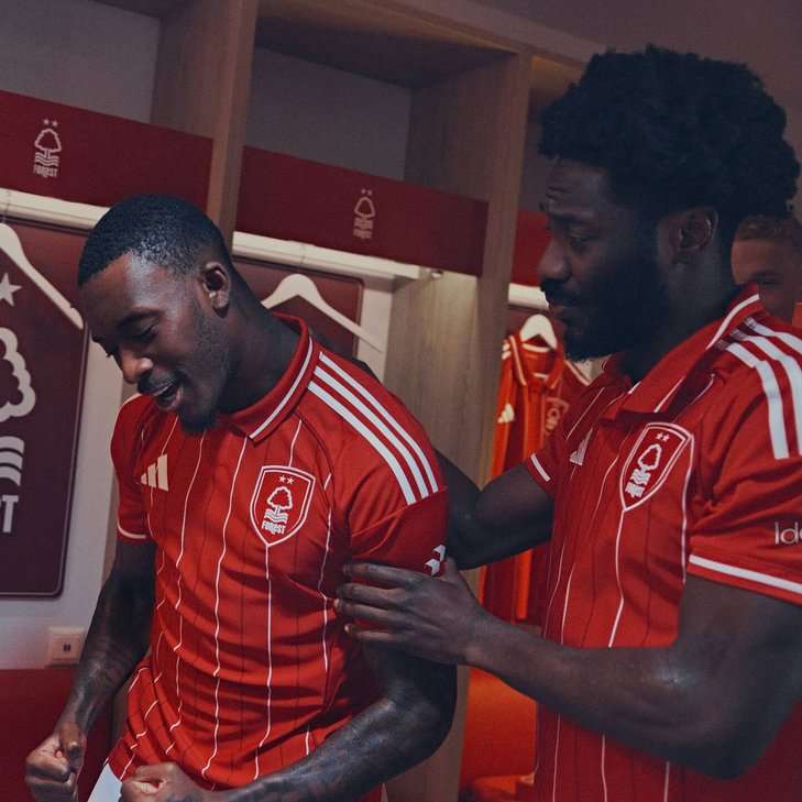 A nova camisa HOME do Nottingham Forest para 2025/26 tem base vermelha com o retorno das listras brancas de 1981/82, agora com listra central escura que moderniza o design.