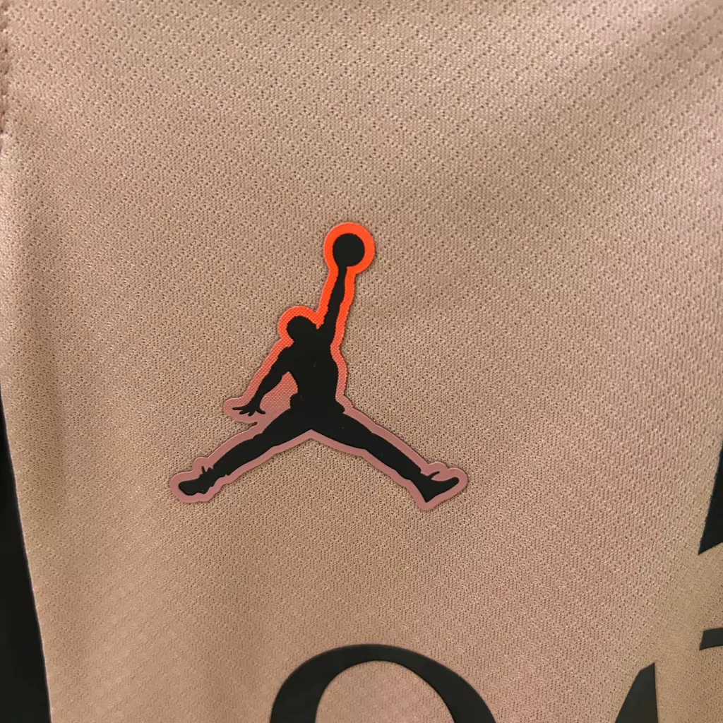 Na parte frontal, há uma faixa vertical central em preto, combinando com o logotipo da Jordan e o escudo do PSG, ambos em tons de preto e rosa.